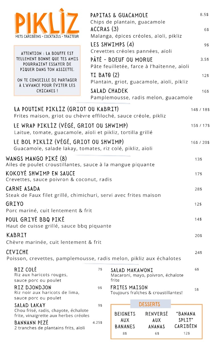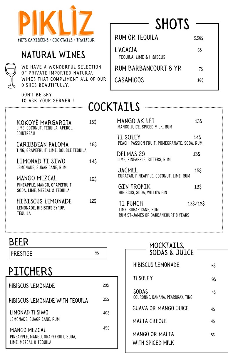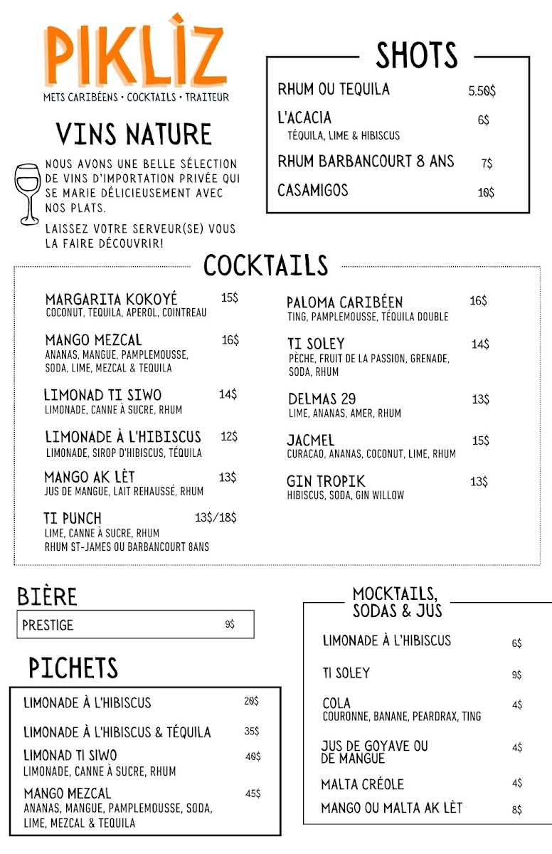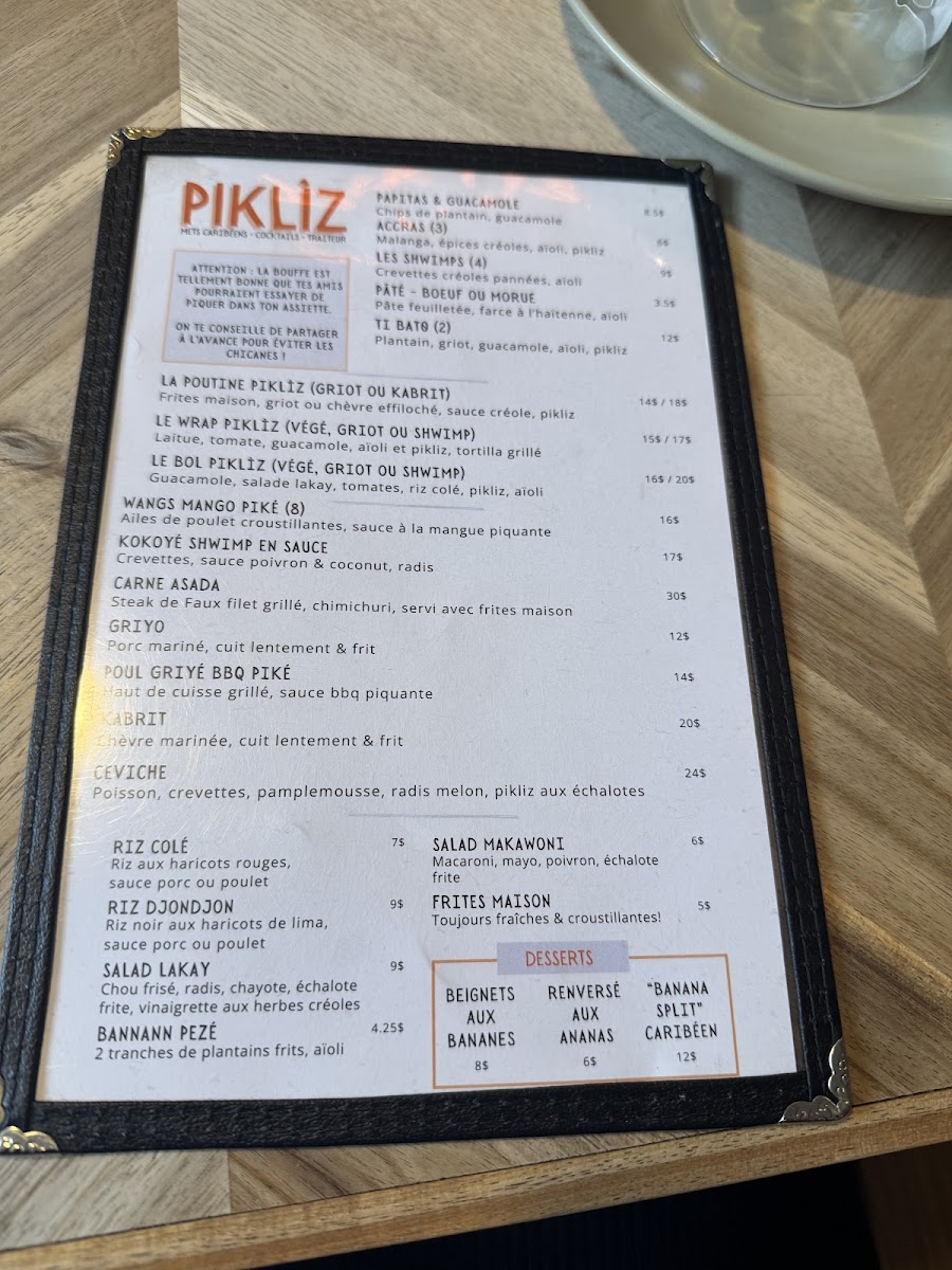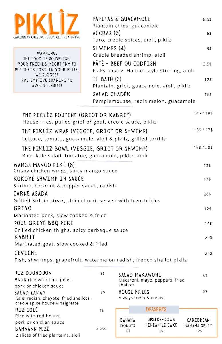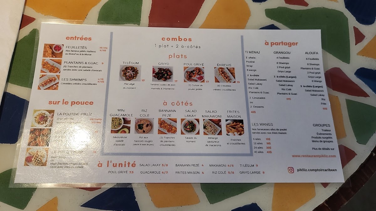The Express menu at Piklìz features the Bol Piklìz, a veggie option that combines frijoles, plantain, guacamole, salad lakay, tomatoes, rice, and aïoli for a well-balanced and satisfying meal. For meat lovers, the Bol Piklìz au griot offers a delectable combination of flavors with griot (pulled pork) as the star ingredient.
