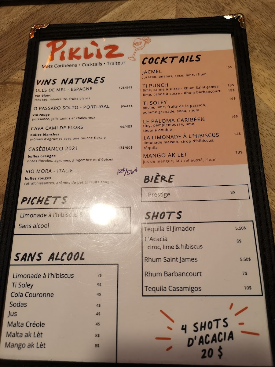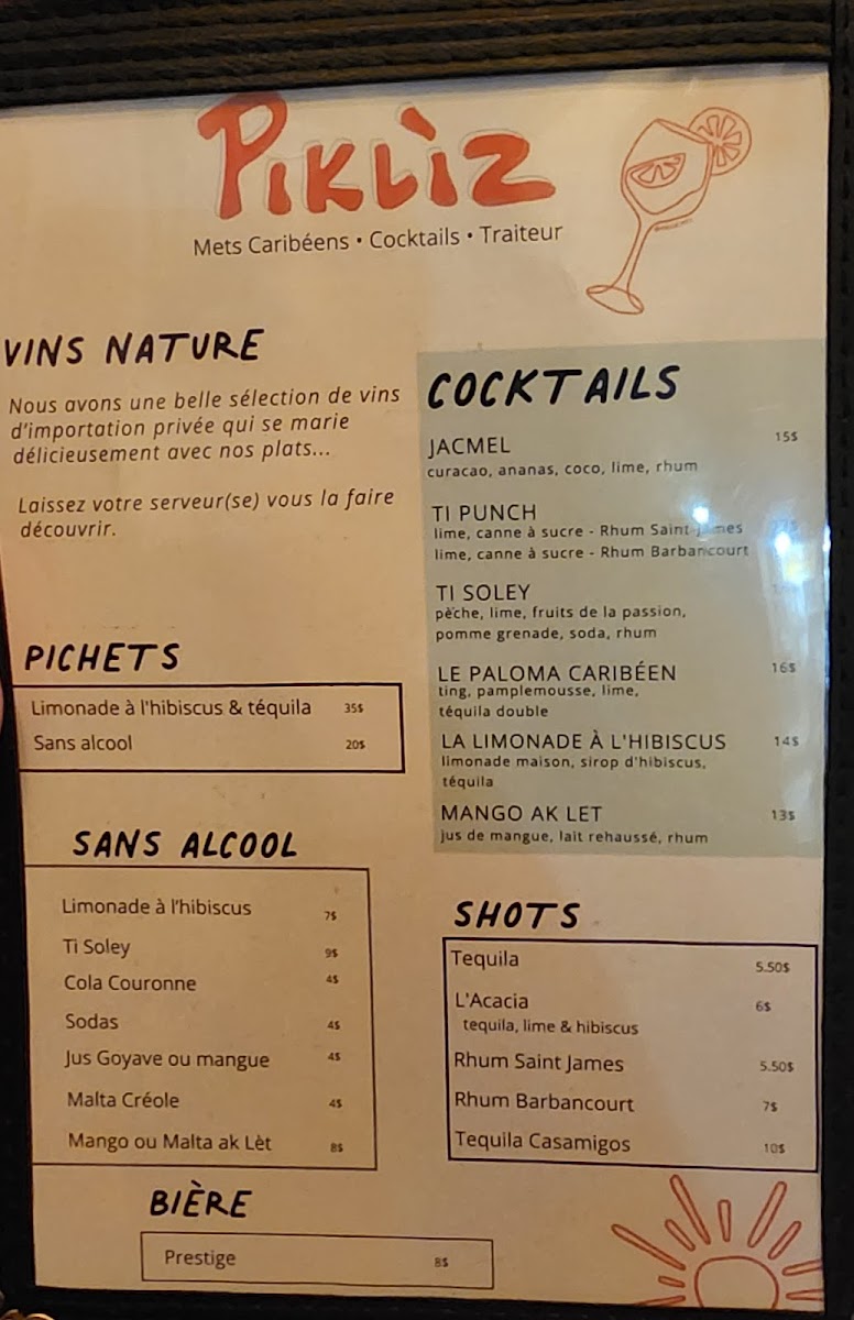 Pair your meal with refreshing beverages like Limonade maison à l'Hibiscus or the tropical Jacmel cocktail. And don't forget to spice up your dish with Pikliz, a flavorful Haitian cabbage salad that adds a kick of Caribbean flair to every bite.